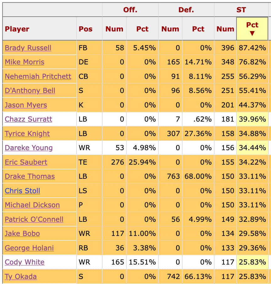 Harbaugh, Dickson, Myers, Shaheed, and Chris Stoll all return. The most important special teamer leaving is Dareke Young. 13 of the top 15 players in special teams snaps are under contract with Seattle: