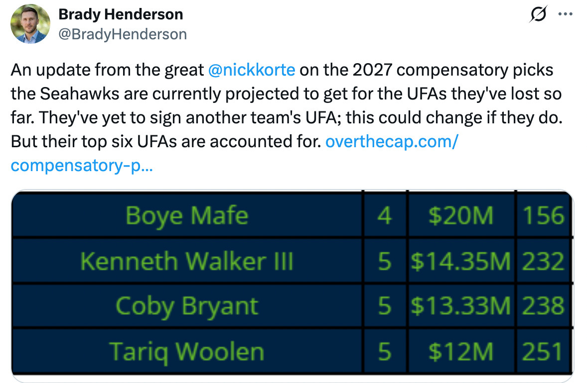 That would be quite a nice boost for Seattle’s overall draft capital and could give John Schneider a little more comfort if he decides to borrow from 2027 to get another pick in 2026. Although the Seahawks can’t trade next year’s comp picks (they don’t even have them yet) they could trade their own picks with the comfort that they will get comp picks next year.