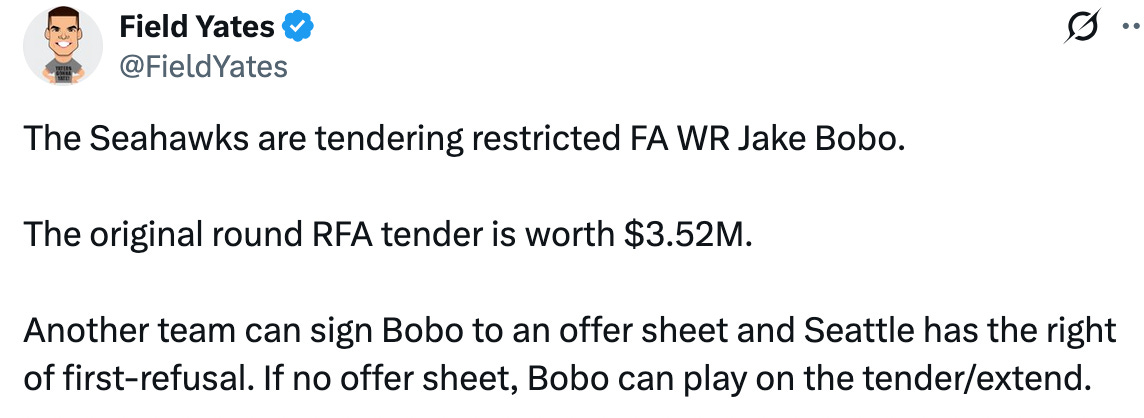 I wrote about Stoll and Bobo a couple of weeks ago when I covered Seattle’s restricted free agents and predicted that both would sign multi-year deals. So far that’s not the case for Bobo and I did say that an original round tender for would be surprising at $3 million, but the Seahawks can still work around that number for Bobo. This just means he won’t leave in free agency without a fight; Bobo is not a starter but he would definitely make most 53-man rosters in the league.