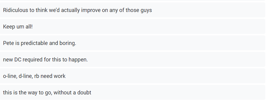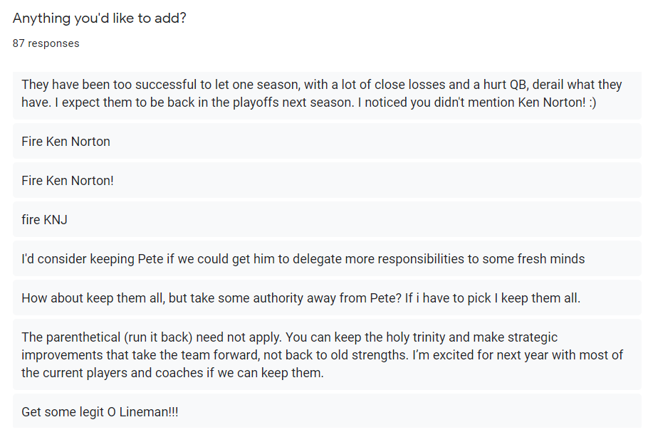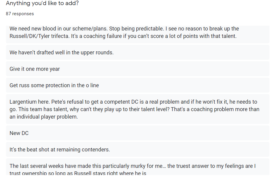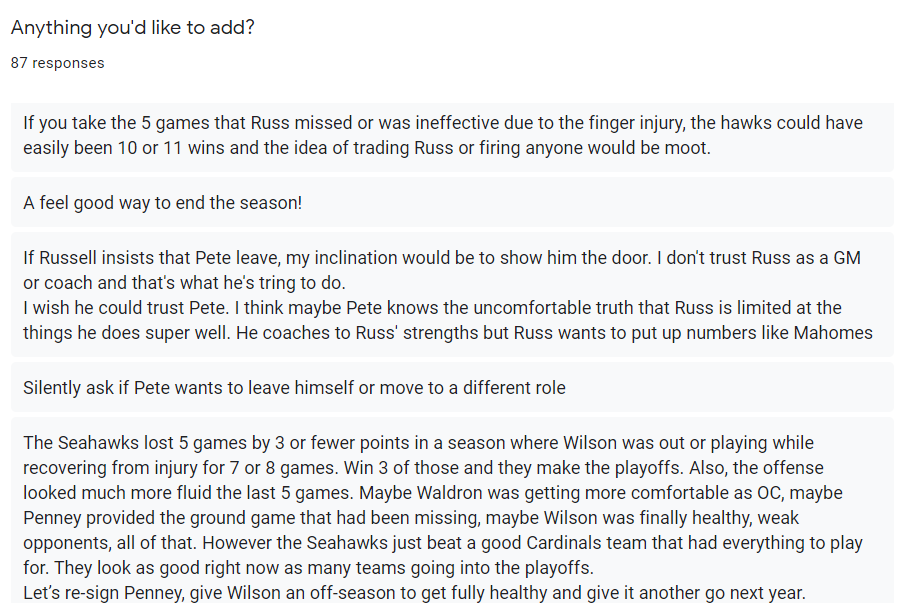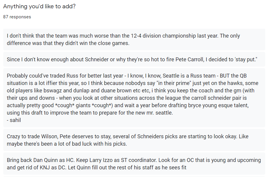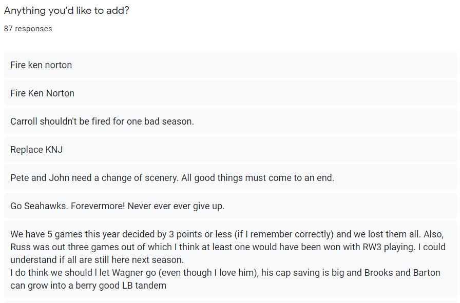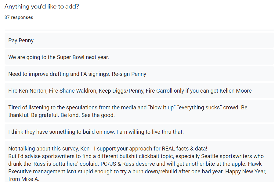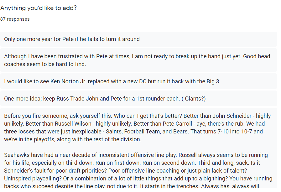 Nearly 62-percent of the 244 votes were in favor of keeping Pete, John, and Russ. The second-most popular answer was 14-percent to just fire Pete Carroll and find a new head coach, but this would also entail finding a new final word on personnel decisions, which would have presumably gone to John Schneider.