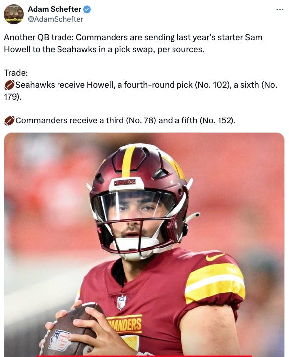 The Seahawks are trading picks 78 and 152 to the Washington Moons in exchange for Sam Howell, pick 102 and pick 179.