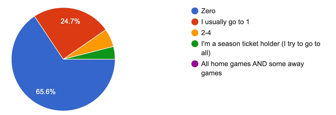 That leaves 5.7% of you answering that you will go to 2-4 games and 4% of you who are season ticket holders and/or plan to attend all the home games. Nobody said that they will go to all the home games + some away games.