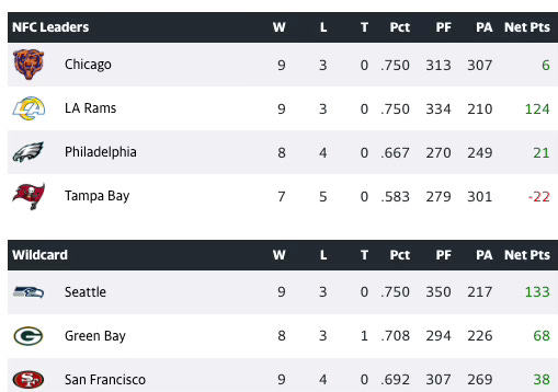 With the Rams losing to the Panthers on Sunday, the Seahawks move into a tie for first place in the NFC West. The Rams still hold the head-to-head tiebreaker and the Bears move into first place in the NFC: