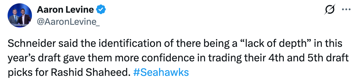 Now not only do the Seahawks have picks 32, 64, and 96 until they get to pick 188, John Schneider is sending up a major green light through the media that Seattle wants to trade down. If the Seahawks trade down far enough, they could end up with their first pick in 2026 being later than their third pick in 2025.
