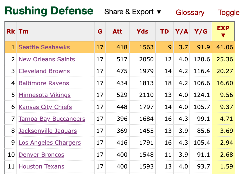 Teams could not run against the Seahawks last year, a fact that I’m betting will get lost in history when fans debate the best defenses of the 21st century. Seattle’s “expected points added” by the run defense alone was almost double the total of the second-best team and more than double the total of the third-place team: