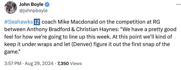 I can’t recall any time in Seahawks history that a starting offensive line wasn’t named prior to week one, but to be fair I don’t have that good of a memory and I wouldn’t know all of the examples anyway.