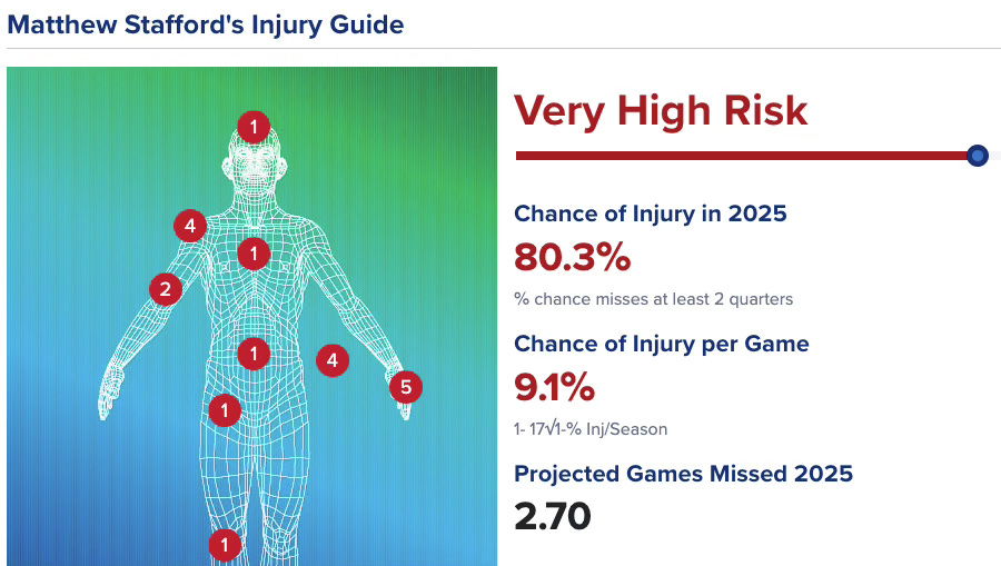 At Stafford’s age, a sore back could be all it takes to miss a game or have a short-term IR stint that costs you four games. And the Rams without Matthew Stafford might as well be called one of the worst teams in the NFC.