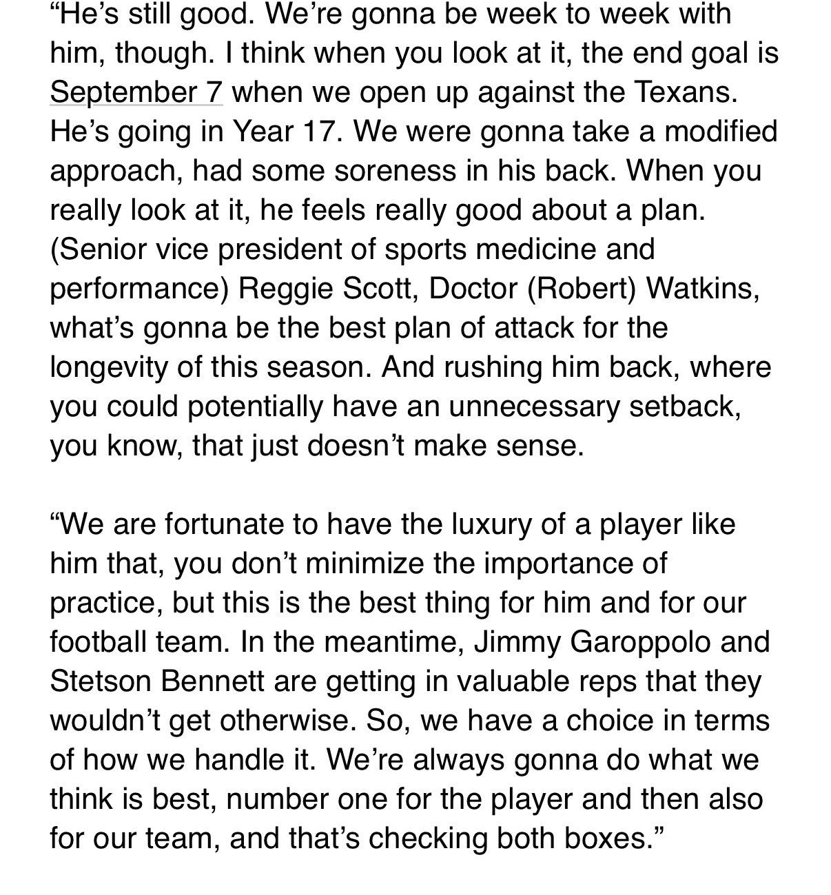 But McVay is addressing Stafford’s injury as an opportunity to get the offense comfortable with Garoppolo in practice, rather than him just being a necessary placeholder. Stafford may be ready for Week 1…