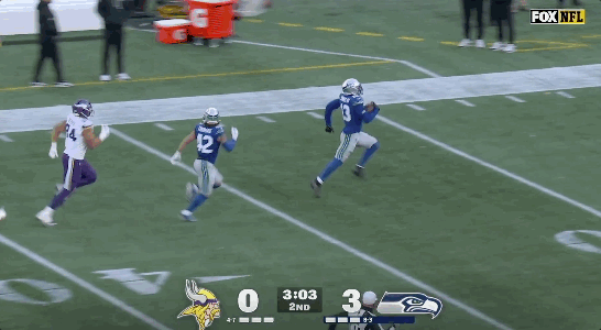 West Seattle Tim: I was struck with how fast Woolen caught up to Jones on his pick 6. Woolen was at least 10-15 yards behind the play and caught up to him on the 10, passing every other player still playing. That dude is fast. But he really should have slide after his pick.