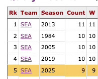 It seems like every time the Seahawks win this season we can look for ways to still be annoyed by “how” they won, but Seattle enters the home stretch with 9 wins in 12 tries. That’s rare. 50 seasons into their existence as a franchise, this is only the 5th time it has ever happened.