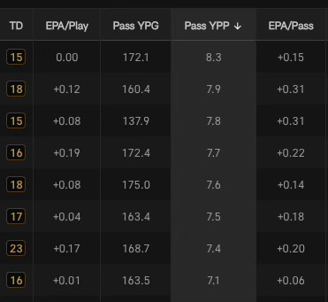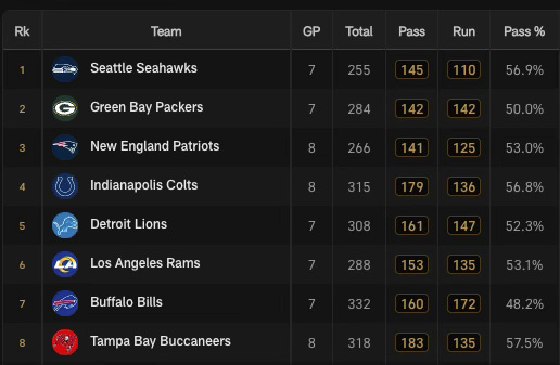 The Seahawks are only 23rd in plays out of motion, but 9th in touchdowns scored on those plays (15), 15th in EPA per play (0.00), and dead-first in passing yards per play out of motion (8.3).