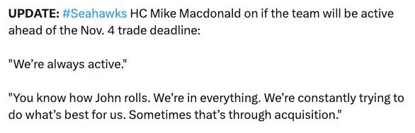 zezinhom400: Looks like Seattle is holding pat at the trade deadline — so we roll with what we got. Prob no way to know what I’m about to ask, but do you think it’s because they really don’t perceive a need, or just weren’t able to get right player/right price?