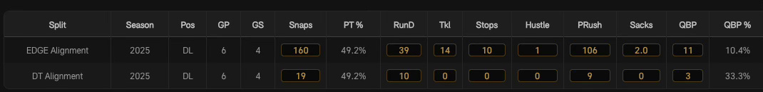 So there’s Jones and there’s Macdonald. As you point out, Byron Murphy II is better this season and his playing time has increased (at least 60% in every game, a mark he only hit twice in his rookie campaign) so that’s more of a very exciting player and no Dre’Mont Jones.