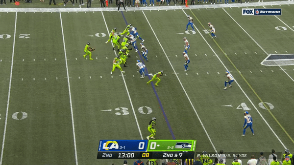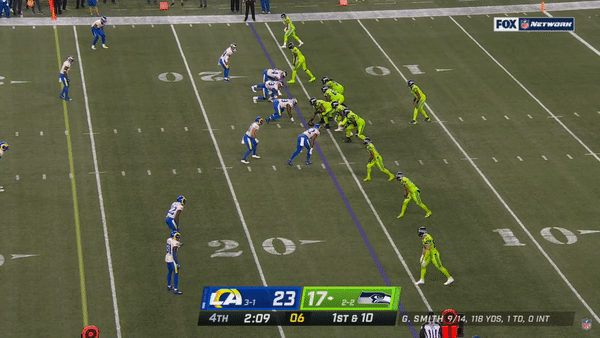 The interception from Geno Smith happened late in the game. Seattle was only down six and Geno was attempting to do his best version of the Russell Wilson two-minute offense, but Lockett was practically nowhere to be found on the throw and the ball landed in the arms of LA safety Nick Scott.