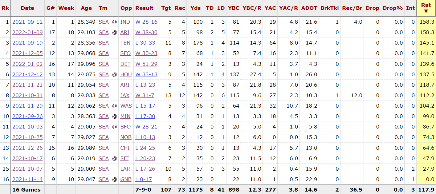 In fact, Seattle is 0-3 in Lockett’s three best career contests by receiving yards. Without looking, can you name the other two?