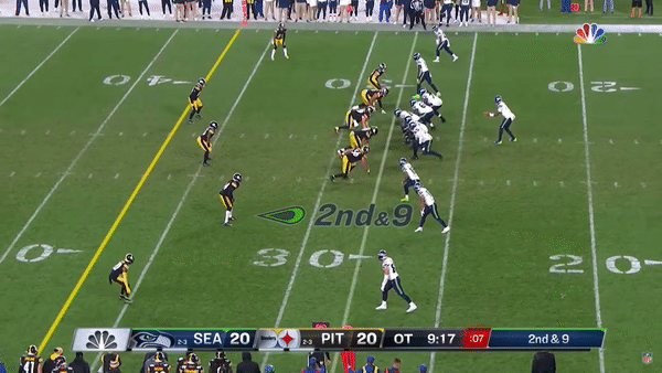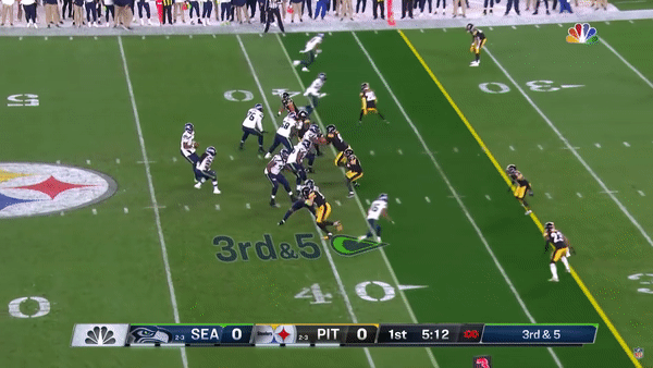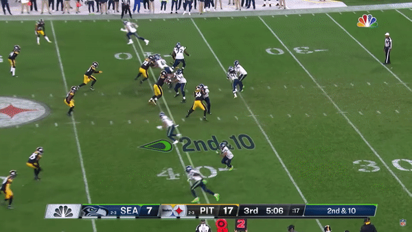 One such play can be found against the Steelers, as Smith dumps an easy screen to Lockett for a catch-and-run first down gain on the sidelines.
