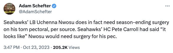 After Pete Carroll said on Monday that Nwosu likely needs season-ending pectoral surgery, the Seahawks must now assess all options with eight days to go before the 2023 trade deadline. Nwosu had played in 70% of Seattle’s defensive snaps this season prior to his injury against the Cardinals, down slightly from his 78% mark in 2022.