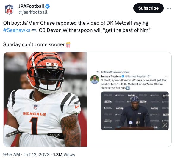 We will see how often Witherspoon is even matched on Chase—Riq Woolen still has something to say about that and we would have thought he’s the guy taking center stage against an opponent’s top receiver prior to the season—but I see Seattle’s defense having “the stoner dog” in them and containing Cincinnati’s top weapon.