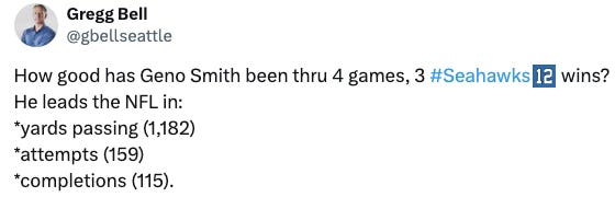 Geno’s been asked to do too much in Seattle’s road games this season (100 attempts in two games, resulting in two touchdowns, one interception, six sacks, it’s too much to put on any quarterback and usually means the team isn’t running the ball well or playing good defense) but the Seahawks are at home this week and per Saturday morning’s non-negotiables, they need to re-solidify that playing in Lumen Field is a nightmare for away teams.