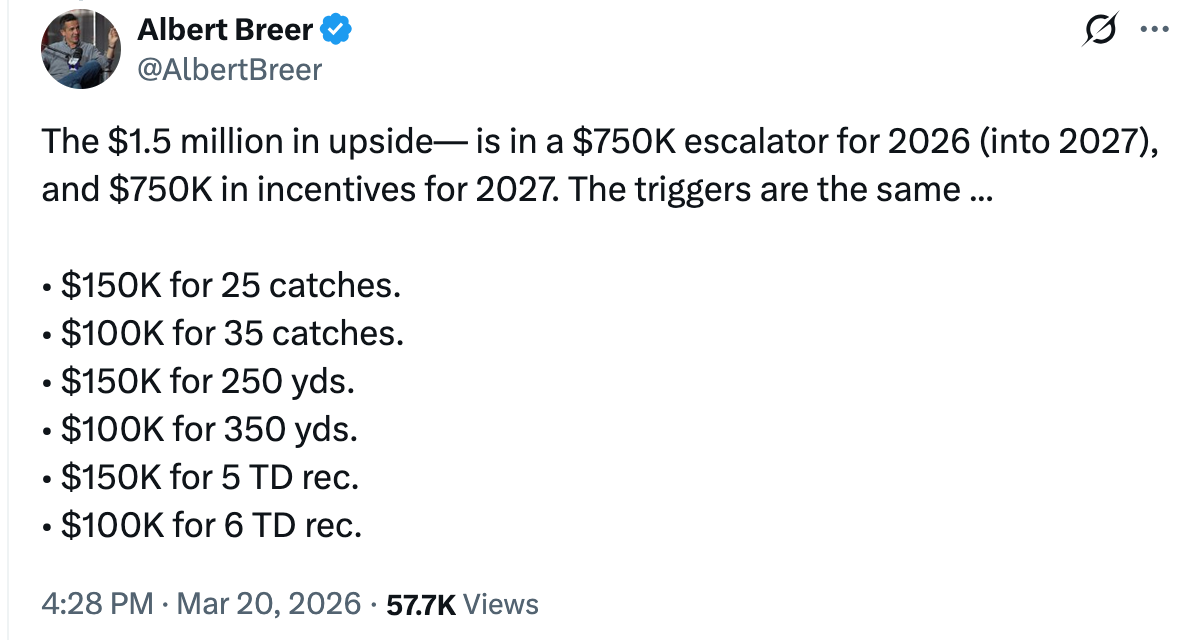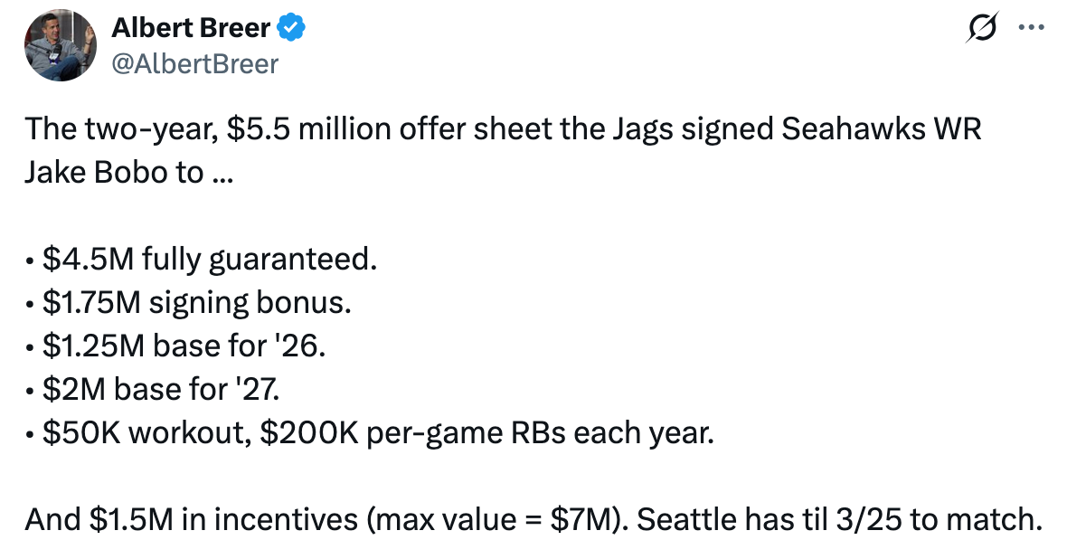 Presumably Jacksonville sees an opportunity for Bobo despite having Brian Thomas, Jakobi Meyers, Travis Hunter, and Parker Washington. It could be that Hunter will almost exclusively play defense and/or Thomas is going to be traded, but it seems like the Jaguars feel Bobo could get more targets there than he would get with the Seahawks.