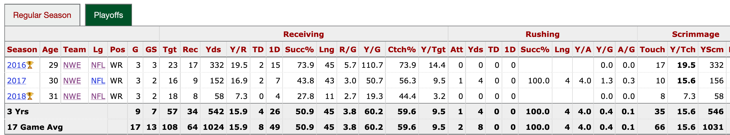 Hogan not only won two Super Bowls with the Patriots (2016, 2018) but he also caught four playoff touchdowns from Tom Brady and led the NFL in yards per touch in consecutive postseasons (2016-2017).