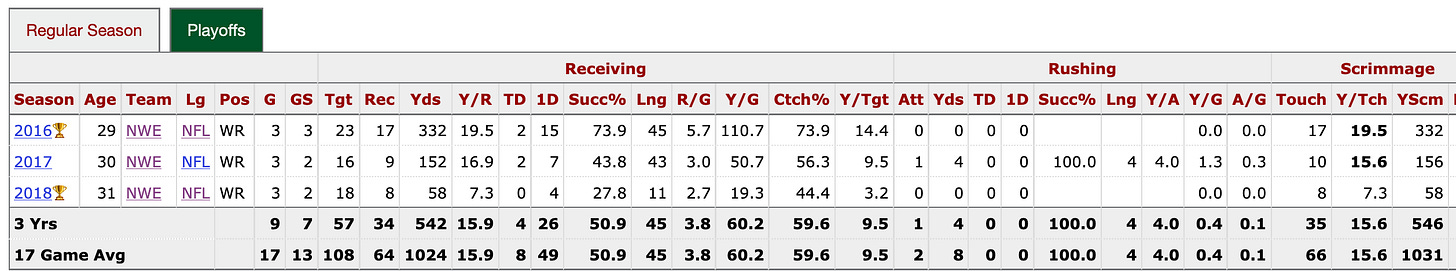 Most people don’t think of Chris Hogan when they think of the most valuable receivers in the 2010s NFL playoffs, or even when they think of the 2016-2018 NFL playoffs, but didn’t Hogan prove that’s exactly what he was for the Patriots?