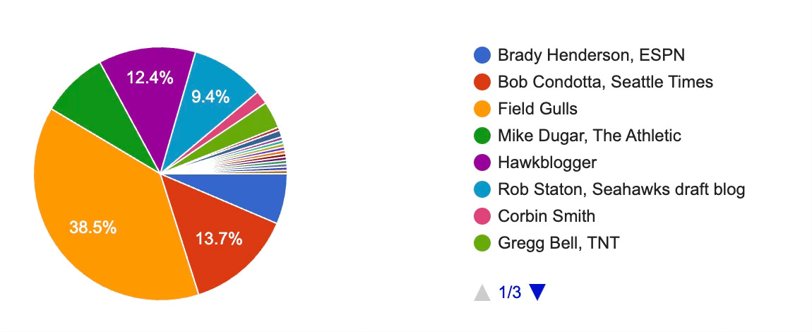 There is only one answer left from last week’s Seahawks fan survey that I haven’t shared with you yet and it was about which media resource you like the most (after Seaside Joe). Unsurprisingly, Field Gulls won in a blowout with 38.5% of the vote: