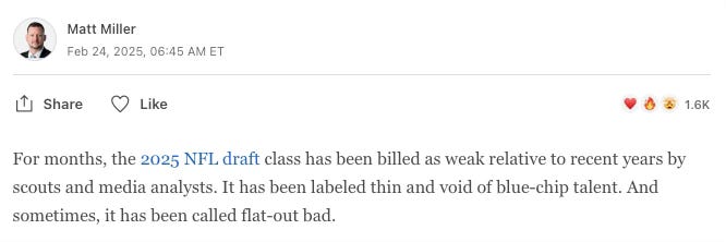 The other issue I see is that the 2025 draft class isn’t very good relative to the average first round.