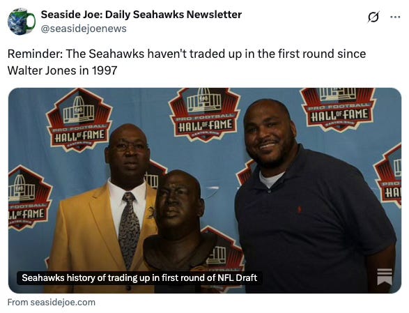 As to your other question if there’s a player who seems like he could be John Schneider’s dream prospect and worth trading up for, I can only guess that it would have to be a player getting top-8 pick hype who slides out of the top-10 and there’s no way to know who that would be; I don’t think there’s ever a guy who the Seahawks panic if they don’t have him and last year Schneider was content with seeing if Byron Murphy II would fall to him or not.