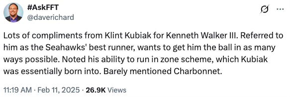 And if Seattle waits, then they can find out for themselves if Walker is going to be the star of Kubiak’s show or if it’s time to turn the page to Charbonnet. There’s just no way to expect anything better than a day three pick right now and that’s less valuable than going into training camp+the season with all of the running backs they currently have.