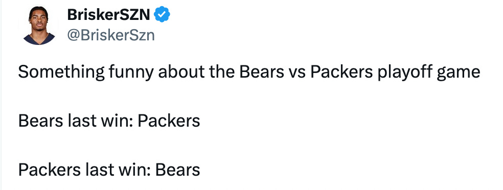 Because if Bears, Rams, 49ers all win, then San Francisco goes to Seattle and L.A. goes to Chicago. You send Matthew Stafford to Chicago in January, that’s not an ideal matchup for him or the Rams.