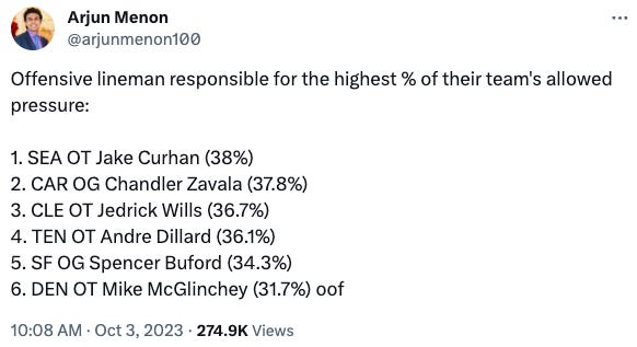 The Bengals defense is giving up yards like...they're the Seahawks defense (ha) but what is their DL like this year? I see they have 12 sacks after 4 games, but the Seahawks only have 16 sacks on the season after that Monday Night Sackball game?!!? Oh my god.