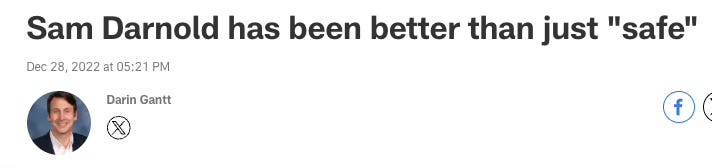 Geno won Comeback Player of the Year after spending the previous seven seasons as a backup. Darnold nearly won that same award after only spending one season behind Brock Purdy, and he never lost his contingent of supporters who swore through his Jets and Panthers years that he was never the biggest problem on those teams. Even at times including the Panthers: